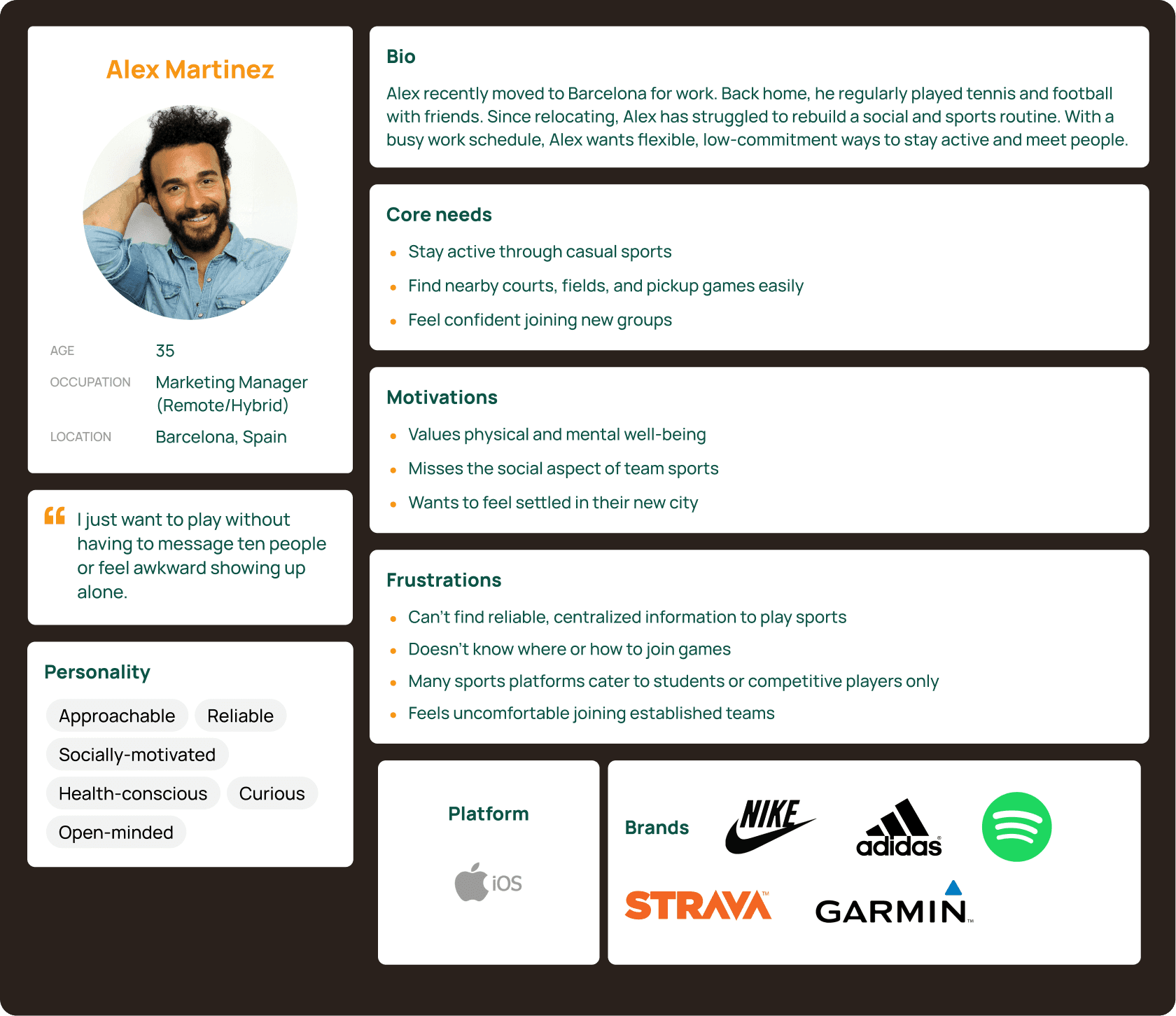 User research confirmed the initial assumption that newcomers and expats struggle to continue playing sports after moving to a new city. The study showed that many adults want to play casually but give up due to scattered information, difficulty finding people and places, lack of flexible options, and discomfort joining unfamiliar groups.