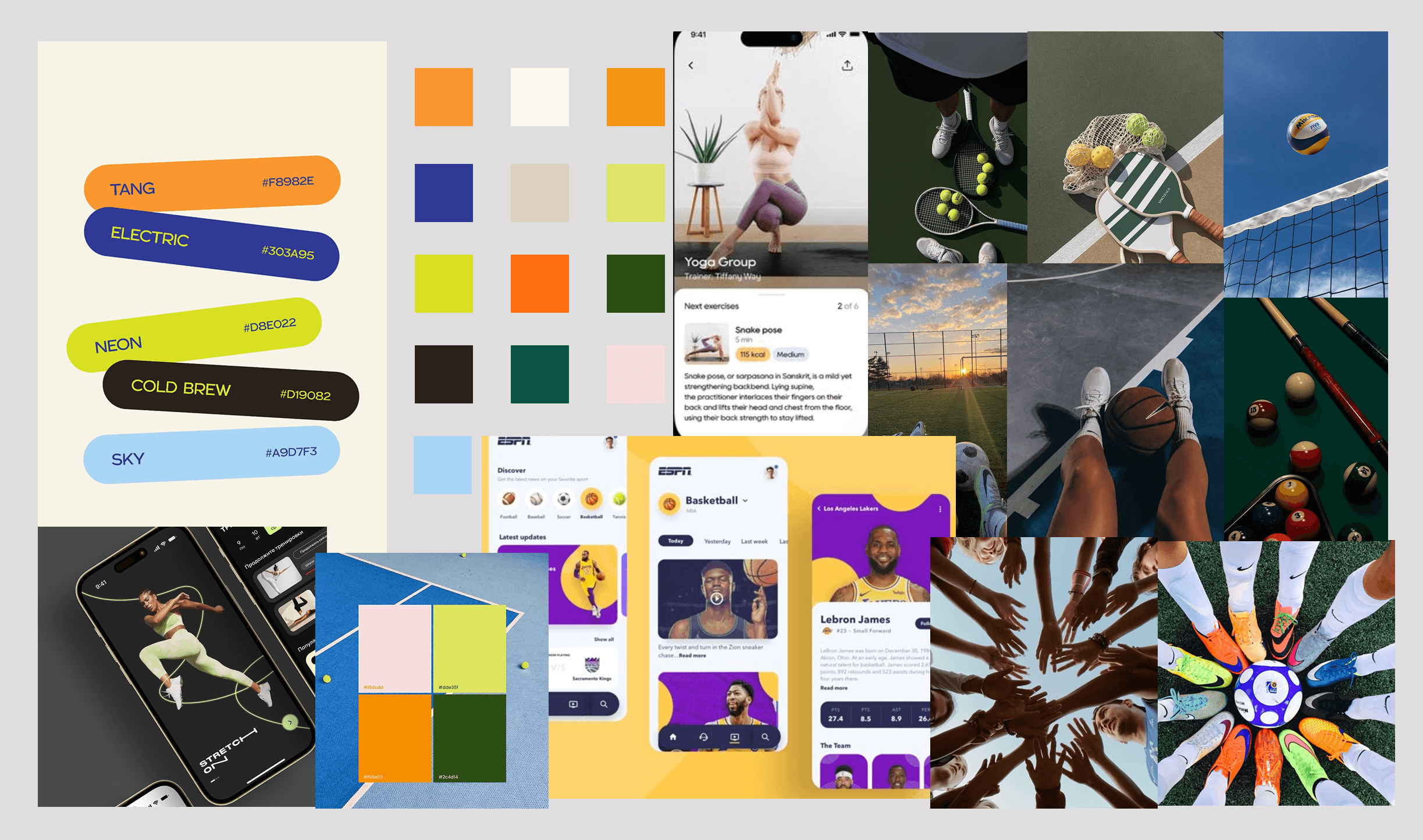 I really wanted to have an app that was refreshing, exciting, clean and energetic to match the feeling of playing sports and having a community. That said, I gather the following inspiration into a moodboard to help me visualize it.