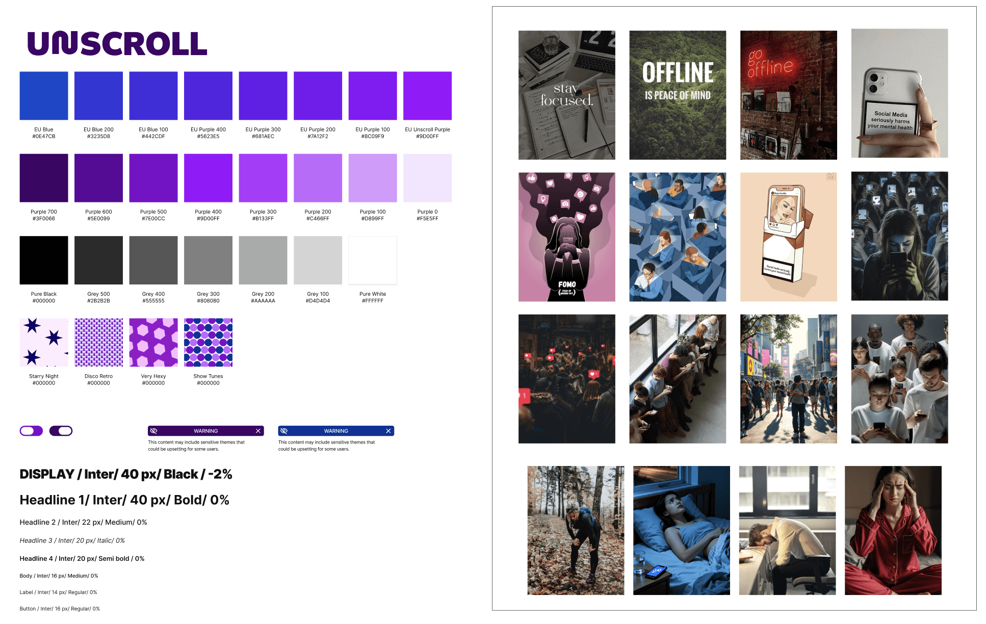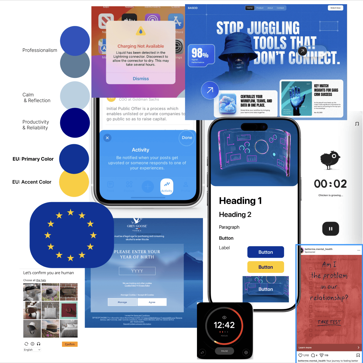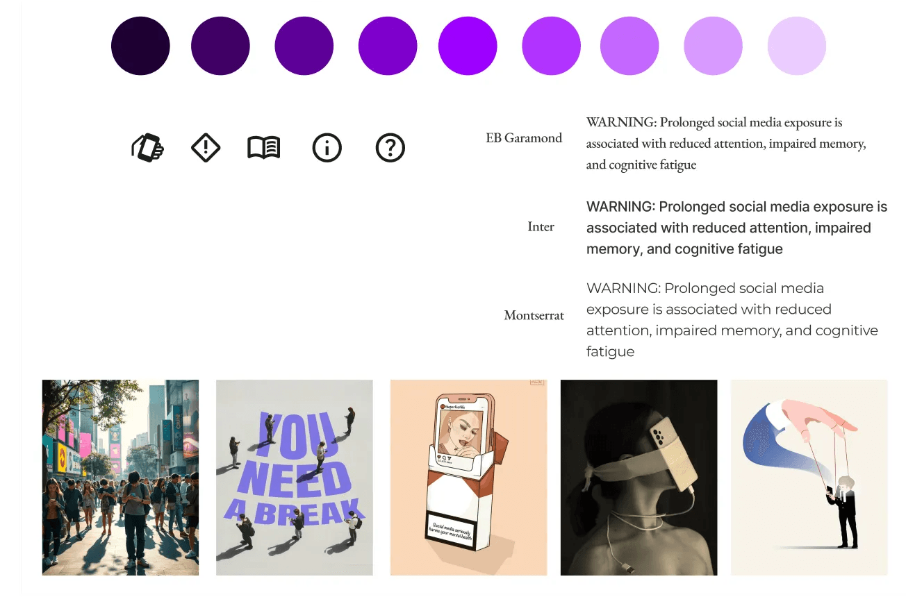 My original thought process when creating my moodboard below was including the EU colors since it would ultimately be an extension of the government for this new legislative campaign. While also intertwining a mix of modern/digital technology to help convey the story of phone use/addiction.