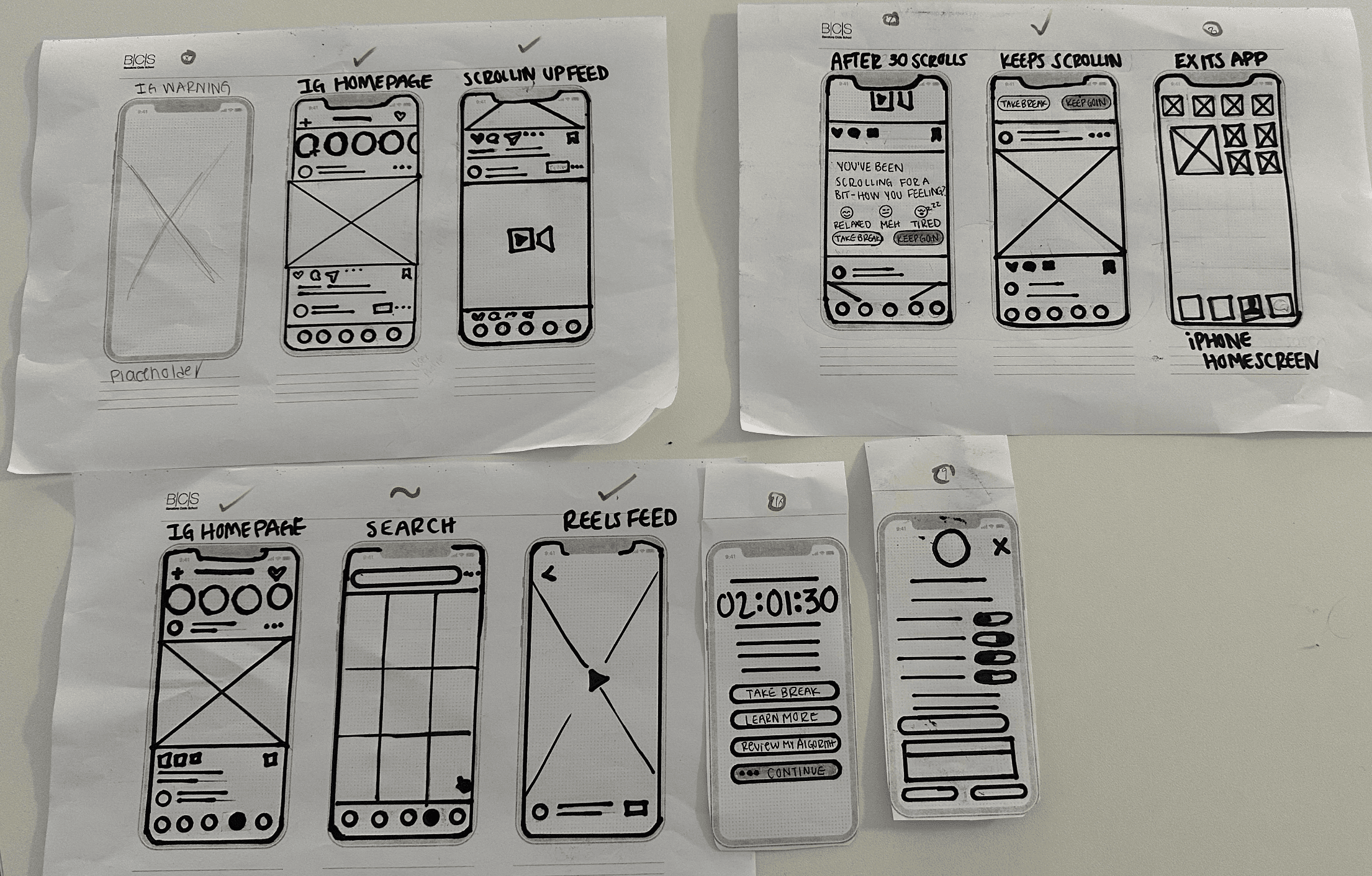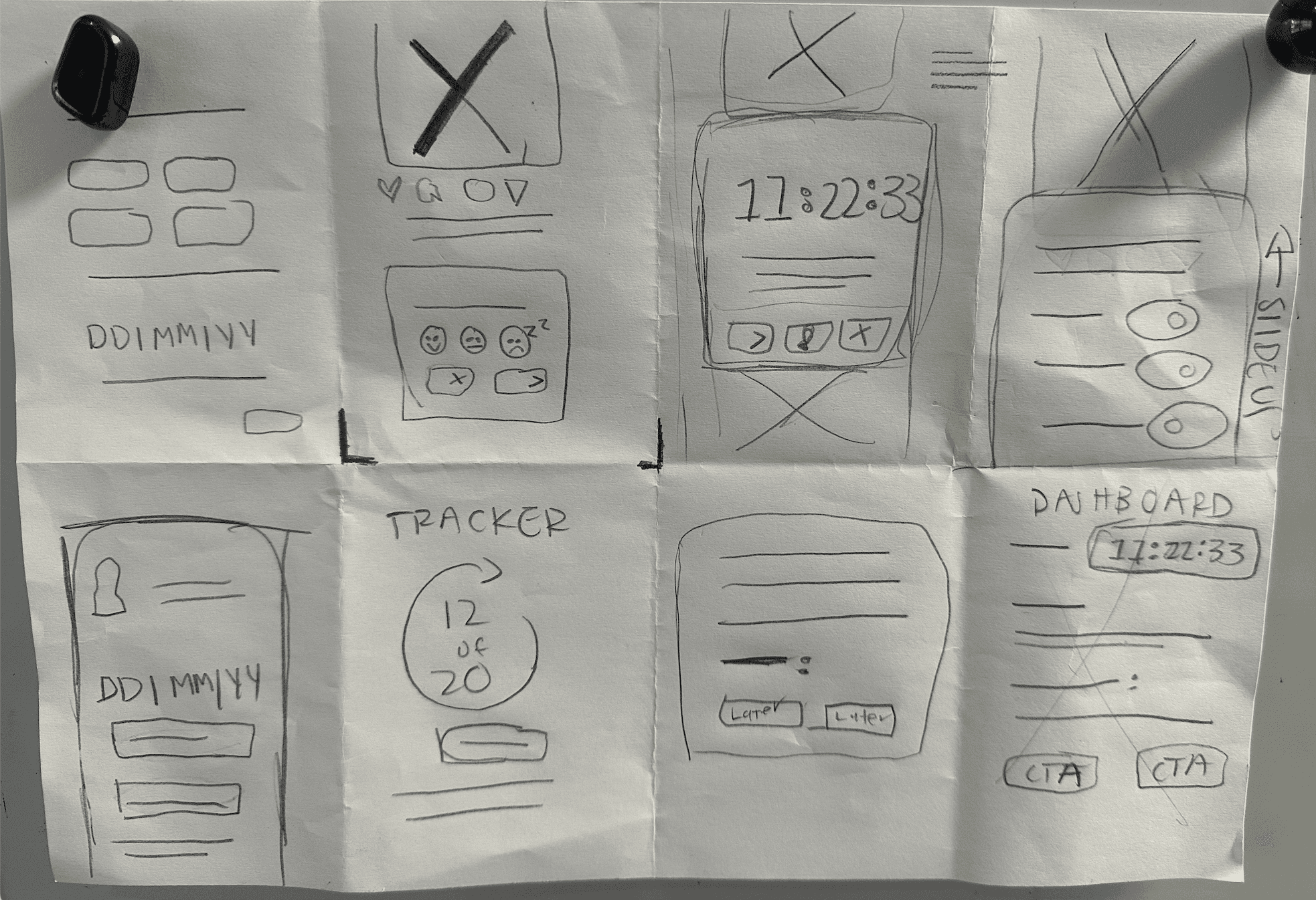 After the crazy 8 sketches, I refined the ideas into paper wireframes.